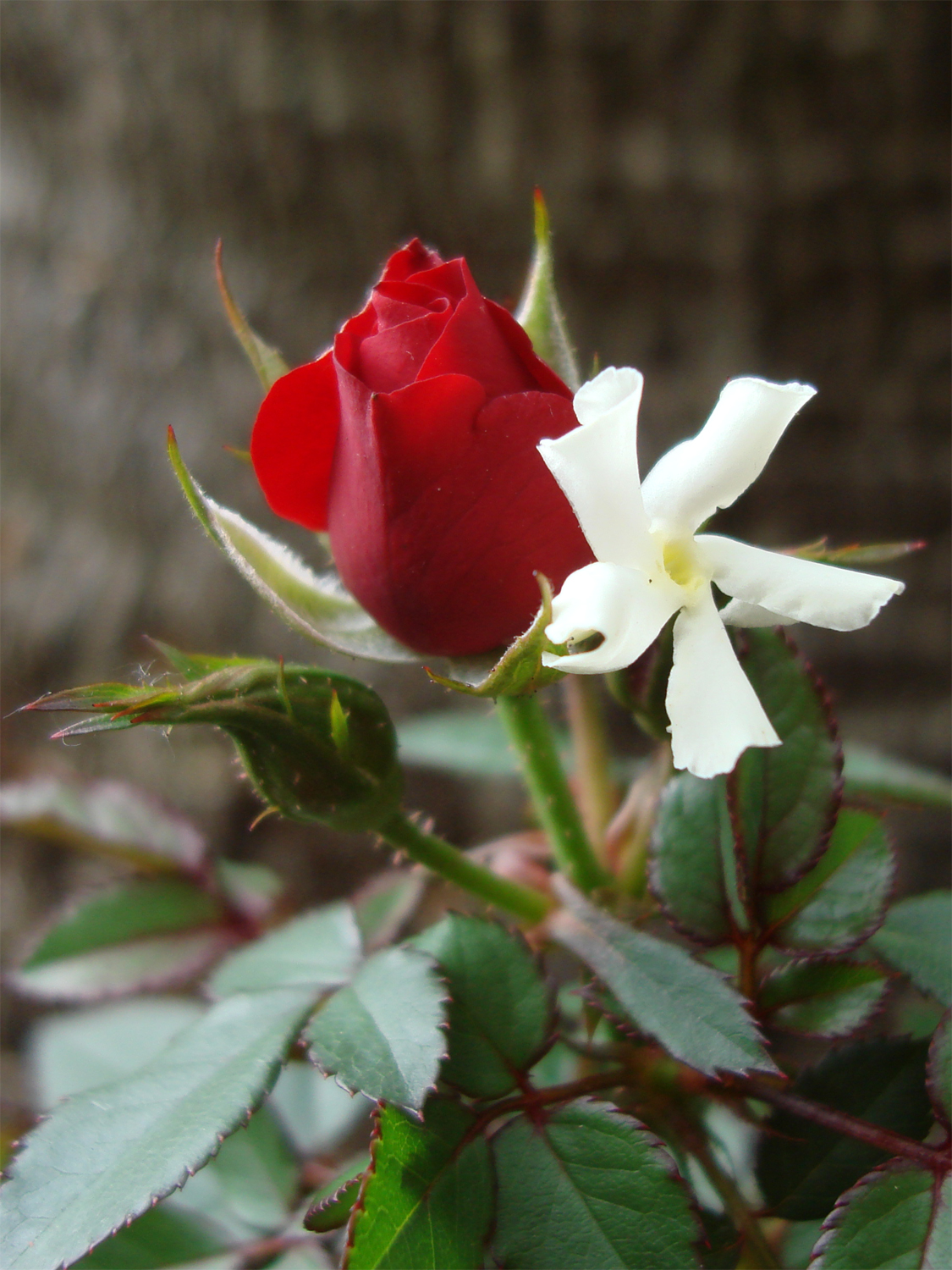 Late May 2008 Jasmine flowers fell through the slats of the patio cover and landed on the rose. |
